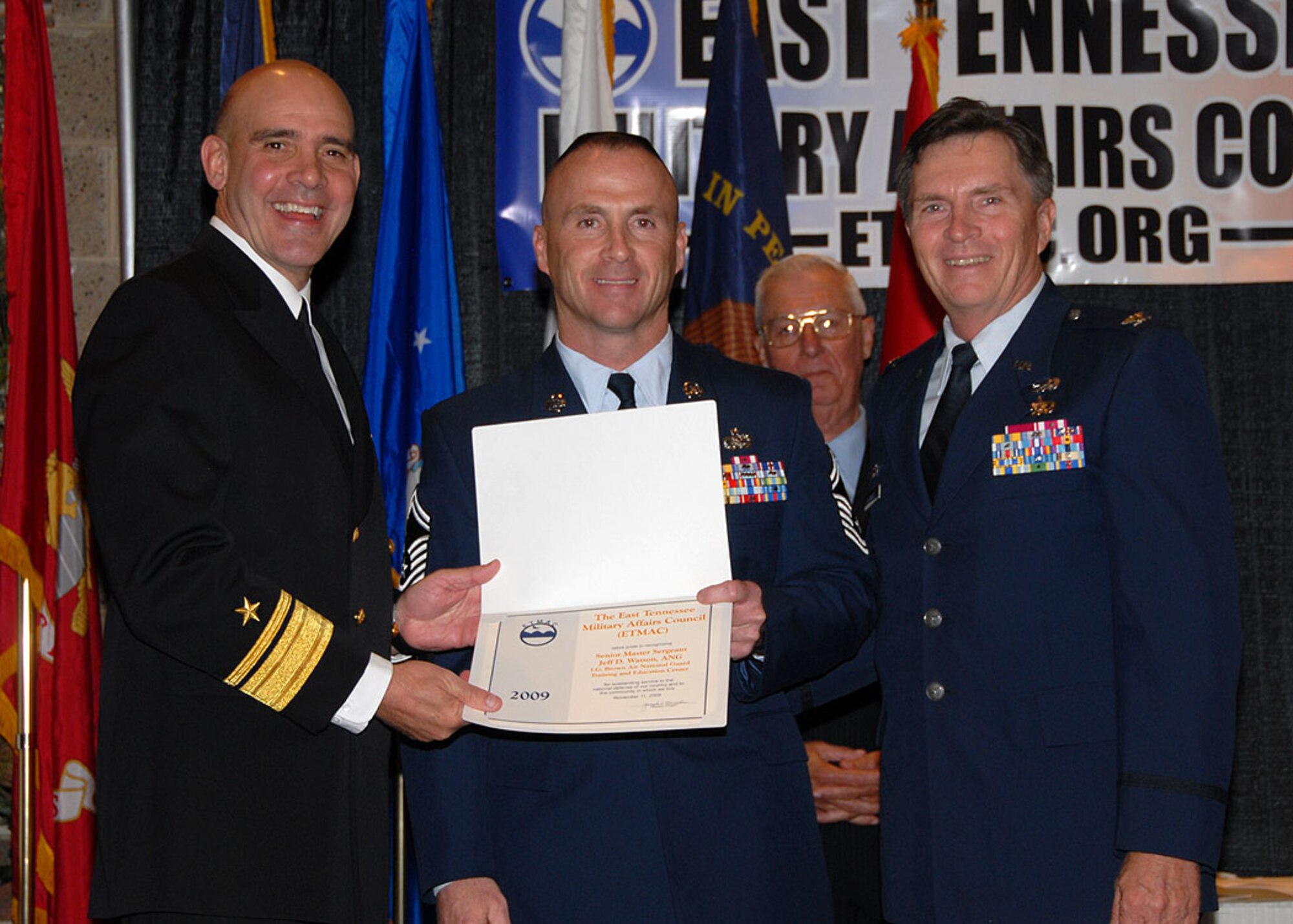 McGHEE TYSON AIR NATIONAL GUARD BASE, Tenn. -- Senior Master Sgt. Jeff D. Watson, center, the superintendent of logistics for The I.G. Brown Air National Guard Training and Education Center here, receives an award from the East Tennessee Military Affairs Council (ETMAC) for outstanding service at the 27th Annual Veteran's Day Commemoration luncheon in Knoxville, Nov. 11, 2009. (U.S. Air Force photo/Released)